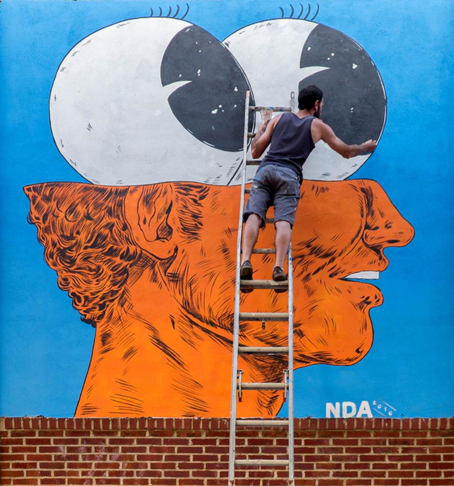 NDA is a public and gallery artist based out of Philadelphia. Although his background is in printmaking and illustration, he is now mostly recognized for his focus on murals and large-scale public work. By combining surrealism, comic humor and real life observations, NDA seeks to shine light on the human condition while at the same time making his audience laugh. His bright and expressive work can be seen around the world from Mexico to Norway. Recent projects have brought him to the Lower East Side for a pop up show in an abandoned market as well as the Newark Museum and a mural with the Philadelphia Mural Arts Program. NDA has also exhibited his work in cities along the east coast such as New York, Philadelphia, Newark and Miami. He has been an artist in residence at Staufferstadt in Strasburg, VA and the Sunnhordland Folkehogskule Teaching Residency in Norway. Additionally, he has been featured in the New York Times, Ginko Press and Esquire.
