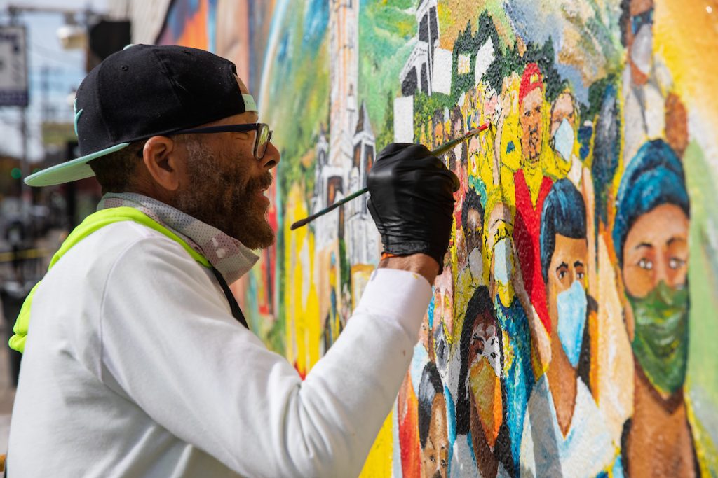 Recently, he painted an abandoned newsstand painted in memory of George Floyd and the happenings of 2020, which was defaced by white supremacists. Randall has since recreated the tribute to Floyd, Never Forgotten, on the side of Tang Pharmacy at 5600 N. 5th Street.