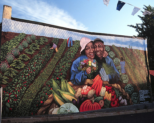 A Celebration of Community by artist Jane Degenhardt-Kutzer was originally conceived as a tribute to the ethnic cuisines found in West Philadelphia. The community expressed an interest in creating a mural around the theme of the family. An older couple who had lived on the block for a long time posed for the photograph. They tended their garden with the same reverence that they cared for each other. The mural is dedicated to the man who lived in the house whose wall the mural is painted is on. He died while the mural was being painted. The artist, originally from San Francisco, was selected for her graphic, colorful style that she developed as an illustrator for children’s books.
