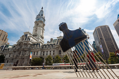Situated across from City Hall on Thomas Paine Plaza in fall 2017, Hank Willis Thomas’ All Power to All People was a public art intervention around identity and representation in Philadelphia. Thomas’ Afro pick sculpture stood at eight feet tall and weighed close to 800 pounds. The Afro pick, as Thomas notes, “exists today as many things to different people: it is worn as adornment, a political emblem, and signature of collective identity. The Afro pick continues to develop itself as a testament to innovation.” The temporary monument was placed here as a symbol and site, as the artist adds, “to highlight ideas related to community, strength, perseverance, comradeship, and resistance to oppression.” Thomas’ work recalled the scale of Pop artist Claes Oldenburg’s monumental everyday objects, such as the Clothespin and Paint Torch, while marking the lack of commemorative statues that address equal justice and belonging.