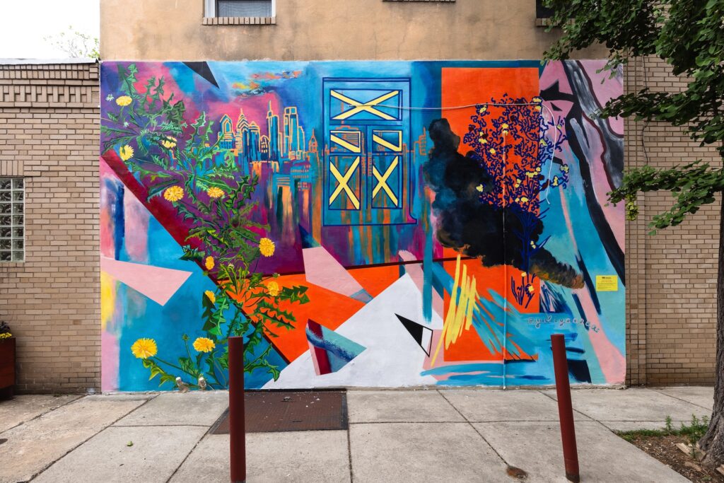 Artist Carlos “Calo” Rosa worked with members of The Guild of the Restorative Justice Program to create Alphabet Bridges. Located on three bridges that cross the railroad tracks that run parallel to Lehigh Avenue in the Kensington section of the city, the murals reflect lively colors and shapes with floral patterns to create bright passageways, metaphors for connecting the past with the present.