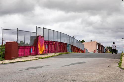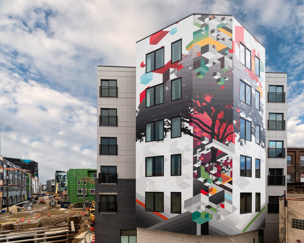 This mural by Felix St. Fort is a modern design of a tree with a colorful visual impact highlighting the building’s architecture. This was accomplished using vector chevron and cube shapes, creating a sense of perspective using flat planes. The work is viewable from multiple angles as the tree reaches across the walls. It is installed on the site of a co-living building in Philadelphia’s Norther Liberties neighborhood constructed in 2019.