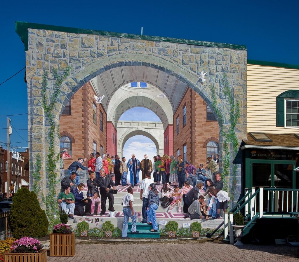 Behold the Open Door by artist Jonathan Laidacker is located in Girard Park neighborhood of Philadelphia, Pennsylvania. The design of the mural is a re-interpretation of Renaissance master Raphael’s 1510 fresco School of Athens located in the Apostolic Palace at the Vatican. The theme of the mural is all about restorative justice which is a form of criminal justice focused on repairing and reintegrating ex-criminal offenders back into society at large.