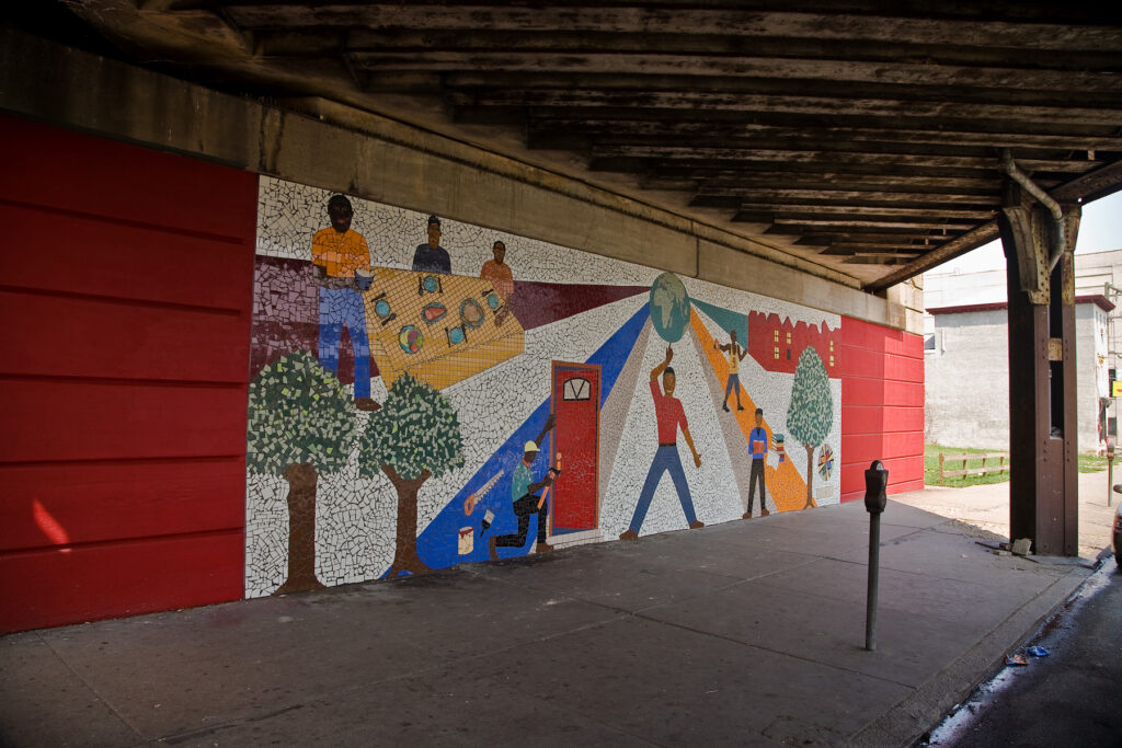 Not too long ago, the parking lot wall of the Great Valu grocery store at 5406 Chester Avenue in Philadelphia, Pennsylvania was stained, topped with razor wire, and crisscrossed with hanging electrical cords. Now, this Kingsessing neighborhood wall is covered in a 166-foot-long mural, stretching out a blossoming branch across green, blue, and yellow triangles. Art gave the wall a second chance, just like the Youth Violence Reduction Partnership Guild (YVRP) participants who worked on it with artist Benjamin Volta.