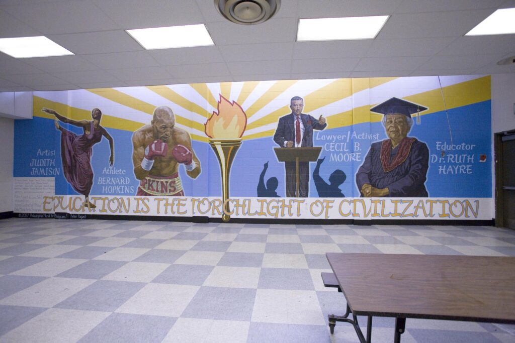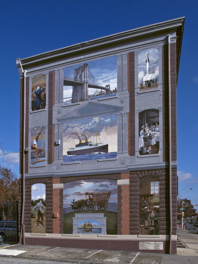 Building America: German-American Immigration & Contributions to the New World by artist Michael Webb is located in the Northern Liberties neighborhood of Philadelphia Pennsylvania. This mural depicts the some of the contributions and untold stories of German immigrants to the United. Painted in a series of ten images on the side of German Society of Pennsylvania City building the mural covers three centuries of German history in the US. The first level closest to the ground represents the 1700’s and focuses on agriculture, the development of the Conestoga Wagon, and and work in textile mills. The second level examines the 1800’s contributions to medicine and healing with a central image of the Hamburg America Line steamer ships that brought many immigrants to the East Coast. The final level looks at the 1900’s contributions to music, engineering and space exploration.