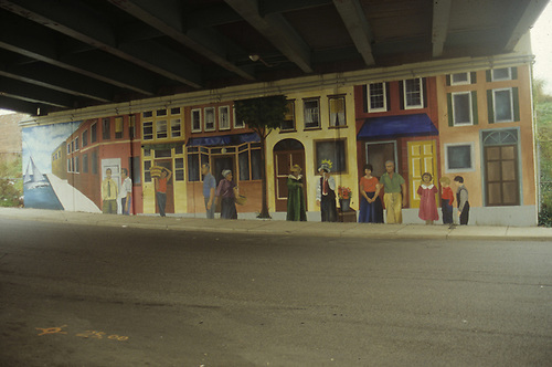 This mural (title unknown) was located in the Callowhill Street Underpass between 2nd and Front Streets in the Old City neighborhood of Philadelphia, Pennsylvania. Created by the Philadelphia Anti-Graffiti Network, this mural took two walls of an underpass and turned them into the peopled street fronts. Houses, and members of the local community populate the fictitious neighborhood. This mural is emblematic of early paintings by Mural Arts focusing on community and representing Philadelphia as a connected city.