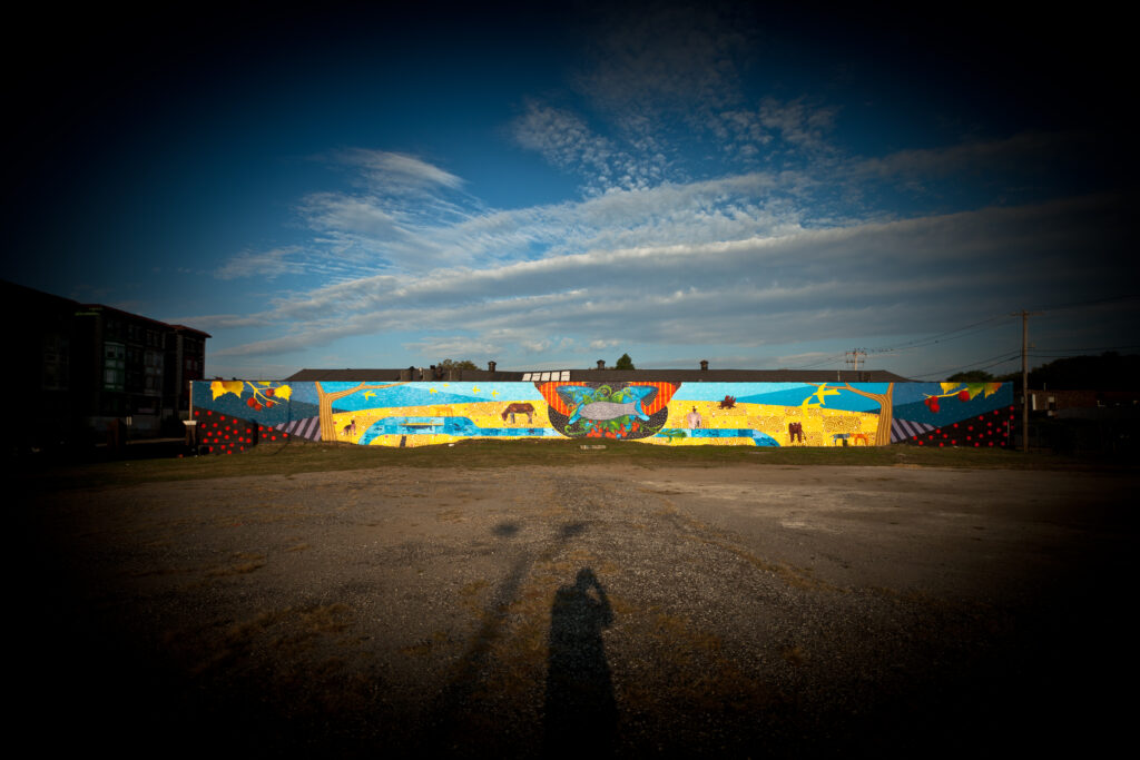 Calm Consideration of Our Existence is a mural by Parris Stancell located at Antioch Christian Fellowship. Antioch Calvary’s mission is to actively work with age and race issues within the community.