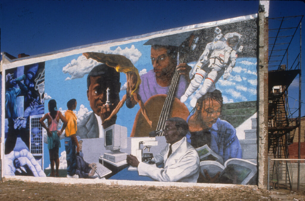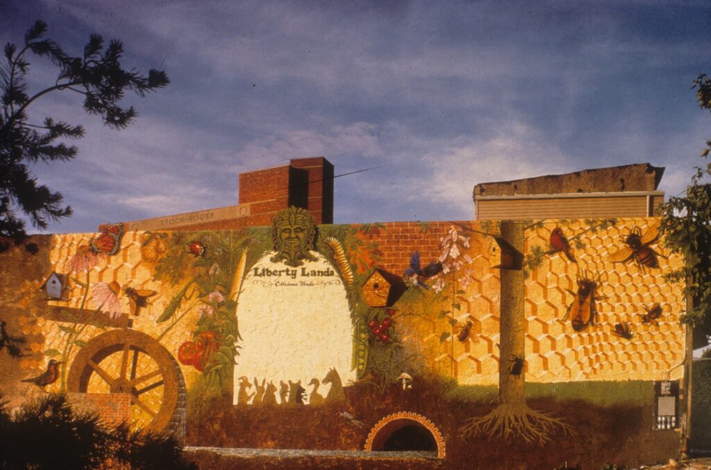 Cinema Verde by artist Dennis Haugh is located in the Northern Liberties neighborhood of Philadelphia, Pennsylvania. On a building boarding the Liberty Lands Park this mural is not just static but activated by the summer drive in movies shown on the white space in the center of the mural. “Cinema Verde” is a play on words; the term “cinema verité” means “the art or technique of filming a motion picture so as to convey candid realism.” Cinema Verde is a play on the term Cinema Verité because the films are shown on the wall in the mural, and the park is a green space– the VERDE in the title. The mural depicts things that are usually found in green spaces: birds, bees, bees’ nests, vegetables, water, trees.