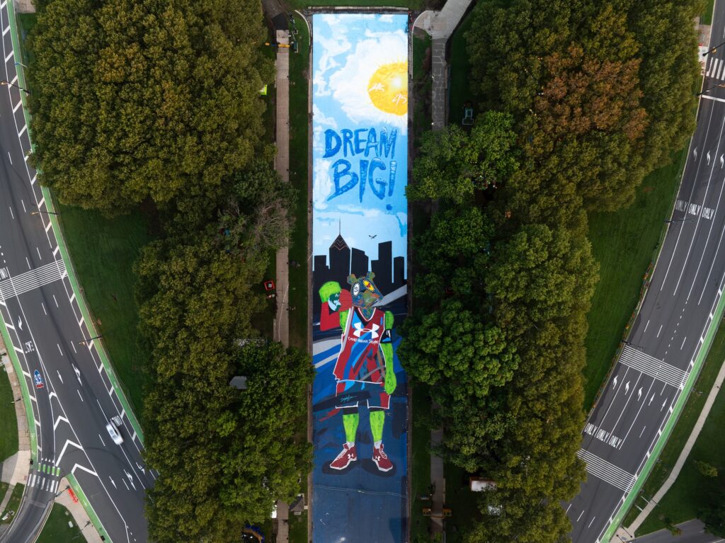 This mural is located in Liberty Lands park. The park was originally the site of Burke Brothers Tannery. By the 1990’s, the site had become an abandoned industrial relic eventually demolished by the city after a failed mixed-use development attempt. A group of neighbors worked together to obtain grant funds to transform the site into a park and community garden. One of the initial plans in the original application was for a large mural on the wall that runs along the south side of the park. That became the Cinema Verde mural completed in 1998. In 2006, the 10th year of the founding of the park, the Mural Arts Program committed to complete a mural on the adjacent wall measuring 24′ high X 60′ wide. This mural, entitled Cohocksink: Stand In The Place Where You Live is essentially about the importance of history and a sense of place. By tracing the path of the now buried Cohocksink Creek which runs beneath the park, the history and geography emerges.