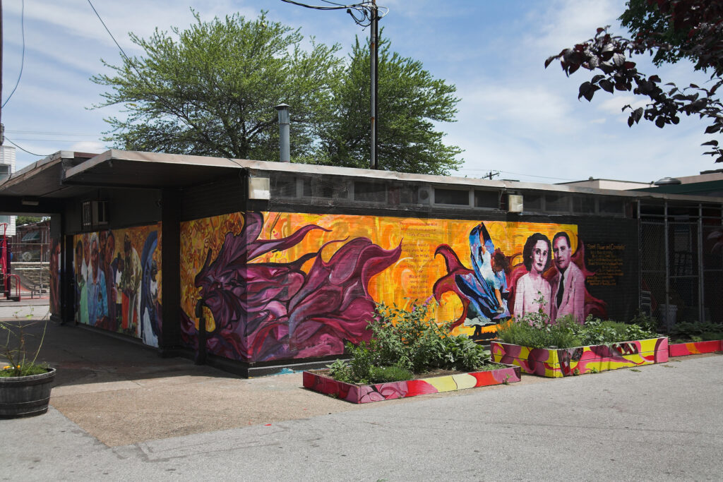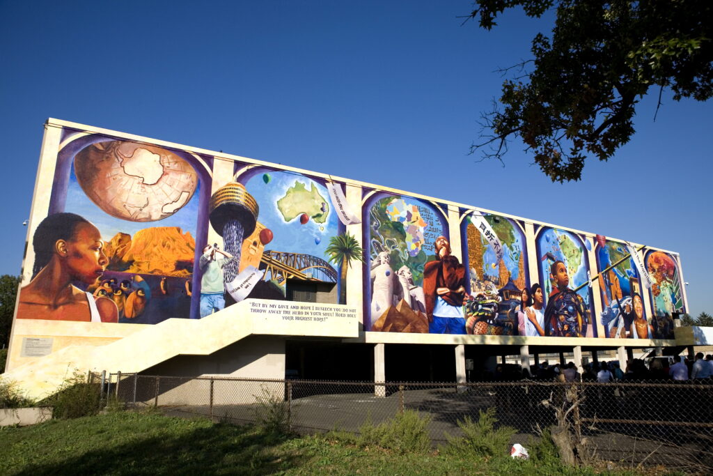 Common Ground, The Global Heritage Project by artist James Burns is painted on a rear exterior wall of the Olney Charter High School in the Olney neighborhood of Philadelphia, Pennsylvania. This project is the result of a collaborative effort between artist James Burns, students and instructors from Olney Charter High School, over one hundred students from the City of Philadelphia, eight students from the city of Dublin, Ireland and their instructors Irene O’Donohugh, and resident artist Fiona Whelan. The project was designed via the internet as well as face-to-face meetings. The students created profiles about themselves, their interests and their heritage. This information was shared via the internet. It was a unique opportunity for students in different parts of the city and the world to work together on a common project.