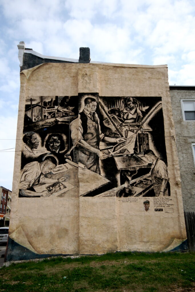 Creation by Ann Northrup (with mosaic work by Beth Clevenstine) was inspired by a collection of photos showing clients of the Pennsylvania Asian Senior Services Center (PASSi) in East Oak Lane. Clients at the center participate in Asian arts projects, concerts, Tai Chi and other sports. The seriousness of their involvement in the arts indicated they were really living a life in art, coming to life through their art, and their art itself was coming to life. This is depicted in the scene of the two foreground calligrapher/painters who are proliferating and creating a wave at the bottom center of the mural, blown by the same wind that tosses the trees seen through a window in the mural. The white “sky” spaces between the leaves are similar to the blown paper shapes or the artwork.