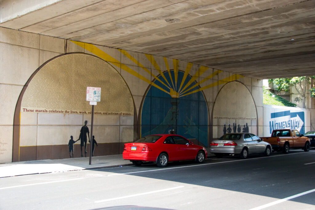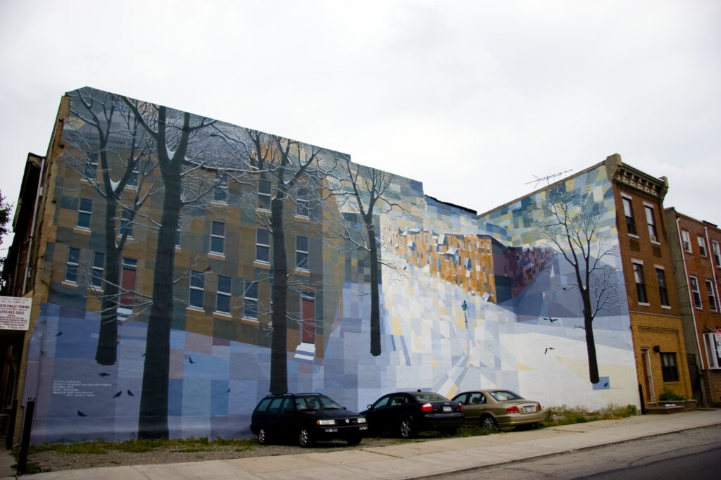 Although Guinn plans the basic structure of murals ahead of time, he likes to invent on the wall, saving decisions about the exact shape and color of his faceted squares until he is actually painting them to absorb the neighborhood colors. Guinn added the skier because he felt the composition needed an emotional center. Guinn lightened and warmed the colors at the end of the central street in response to the building colors nearby (orange and yellow).