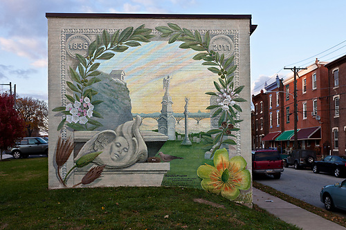 Haugh created this mural at Laurel Hill Cemetery to celebrate the site’s 175th Anniversary. A National Historic Landmark, the cemetery is the final resting place for some of Philadelphia’s most prominent and infamous citizens. It also functions as a site for recreation and as a backdrop for some of Philadelphia’s more famous events include annual Halloween tours and the annual Grave Digger’s Ball. The cemetery’s architecture and art offer interesting visual and social commentary about Philadelphia’s history as a city. The mural is located outside the walls of the cemetery, directly across the street from the entrance, on land that rests between the cemetery and a densely populated neighborhood.