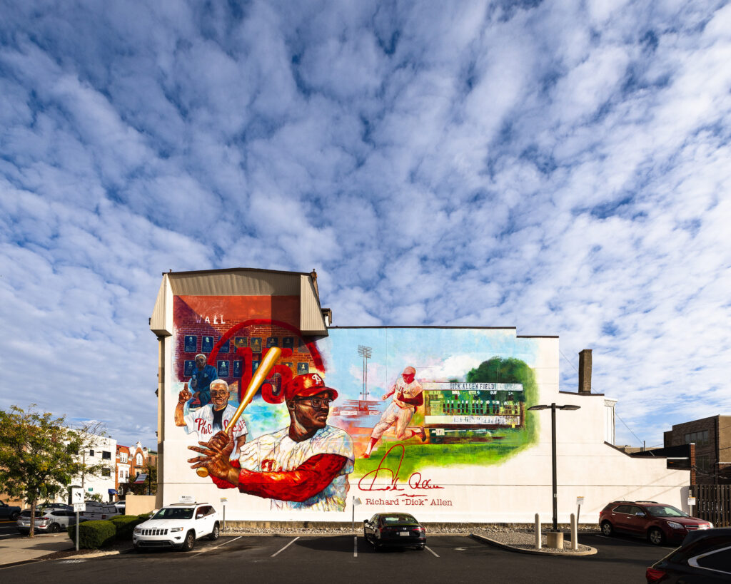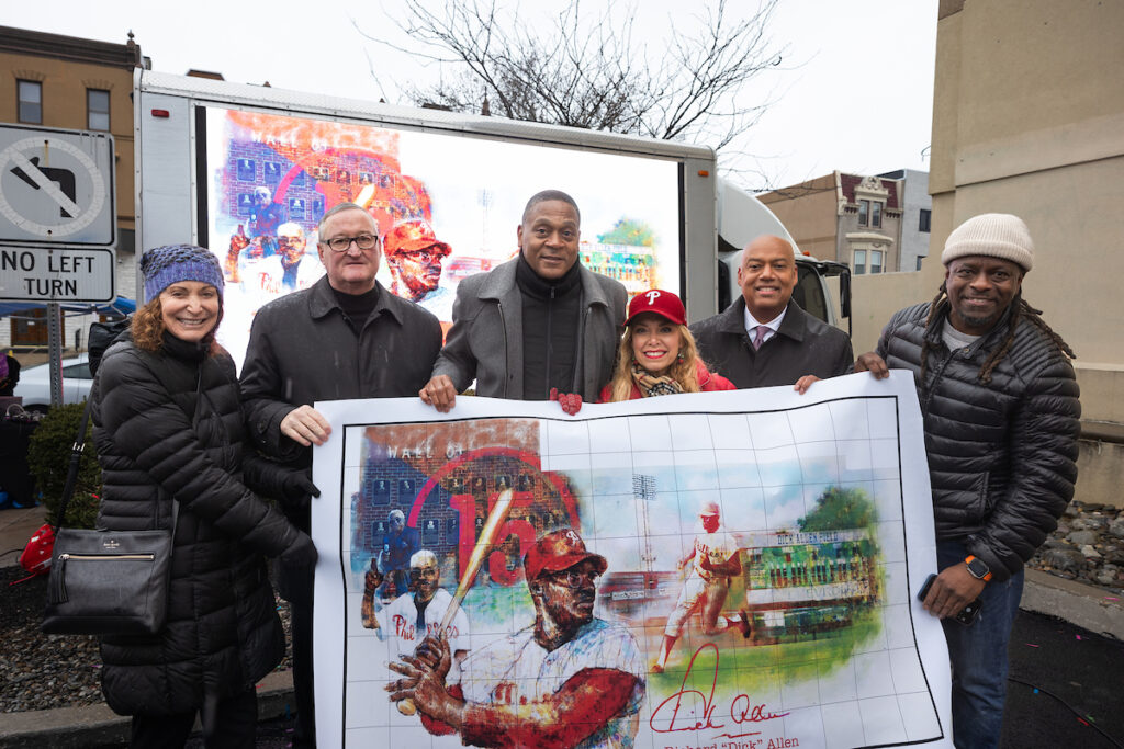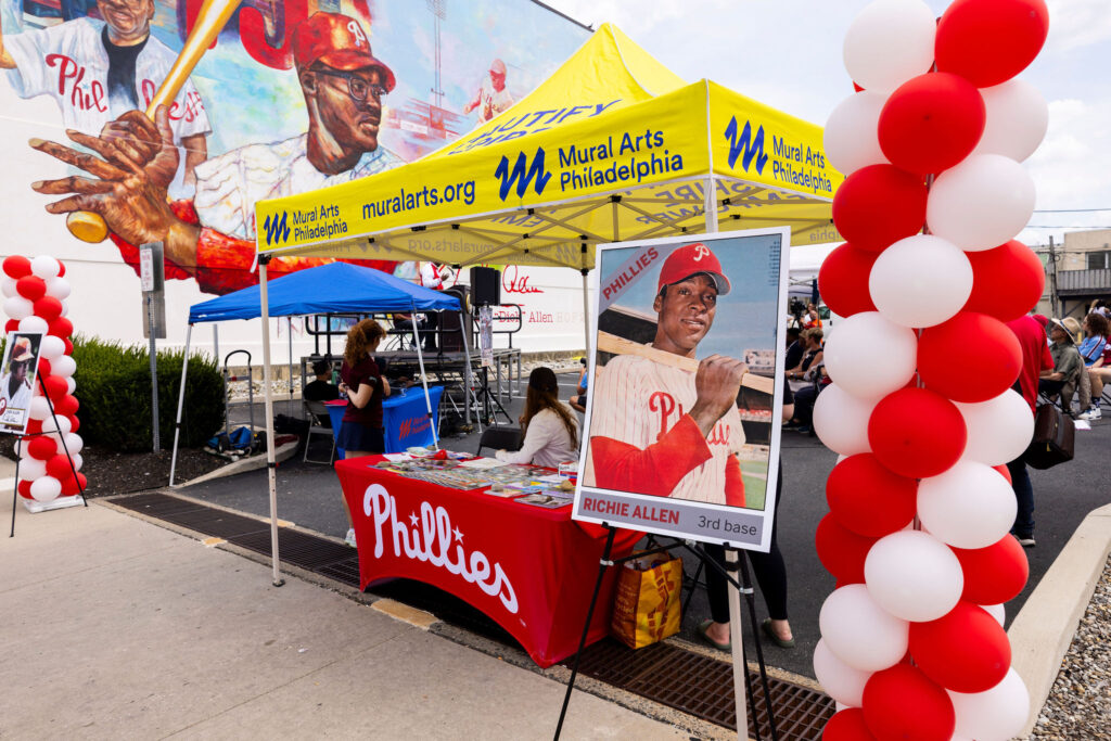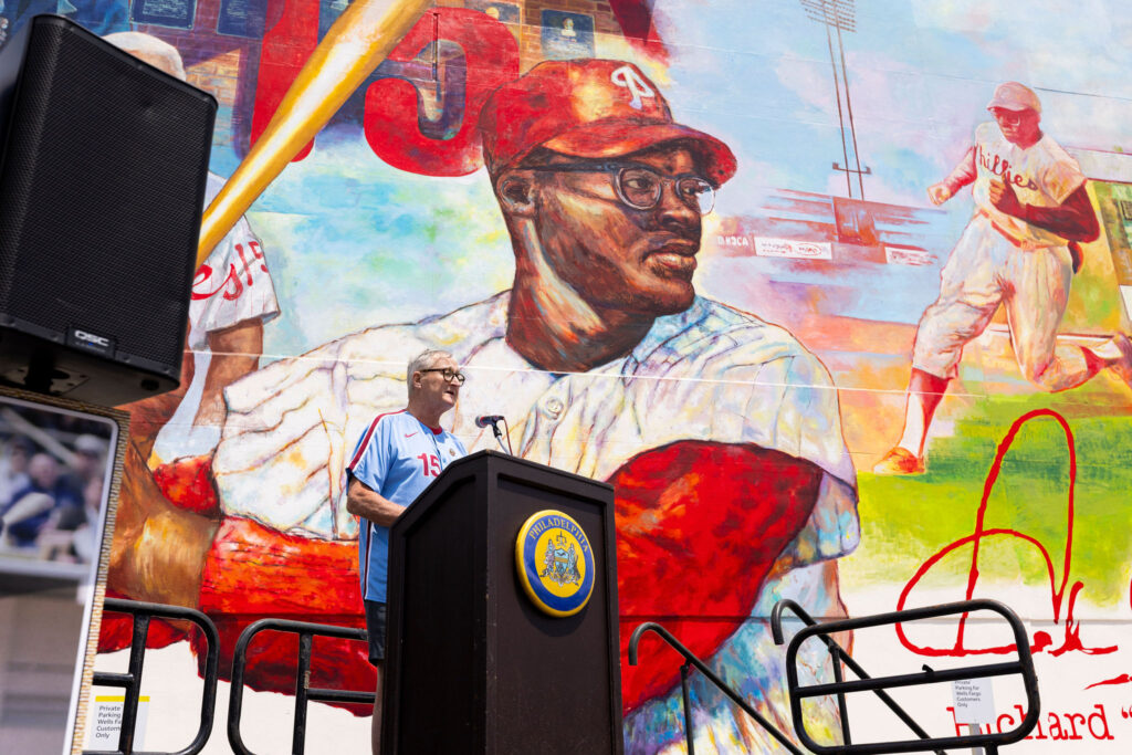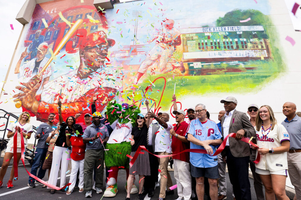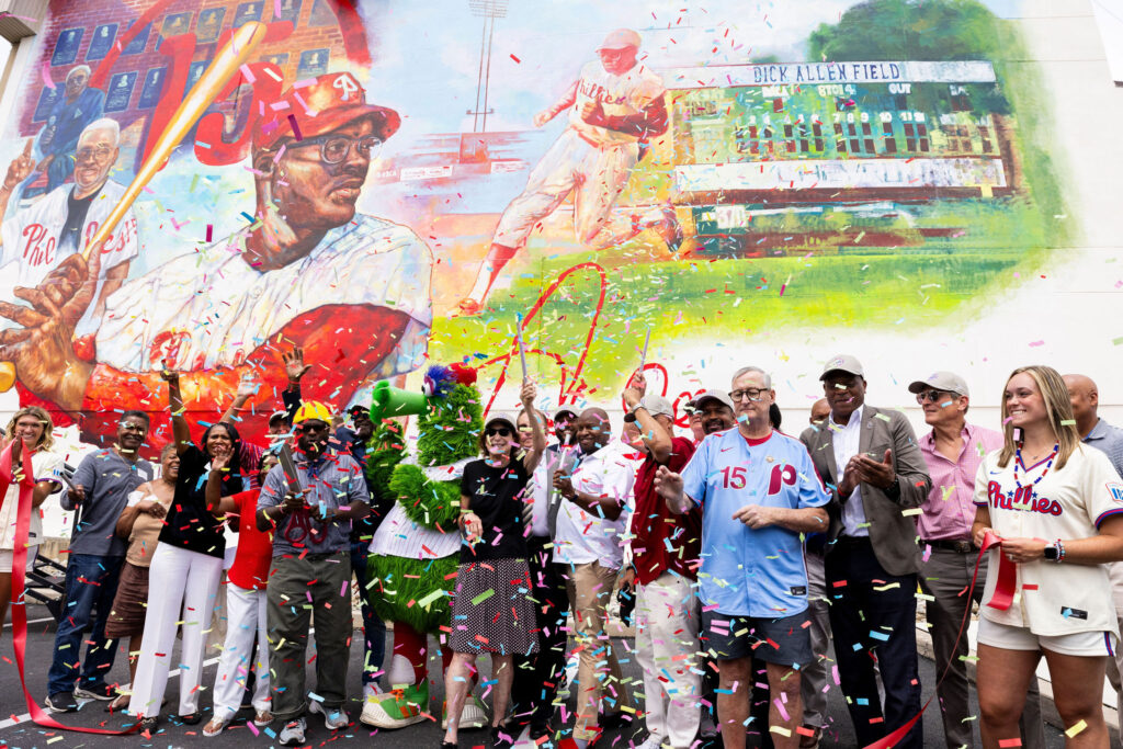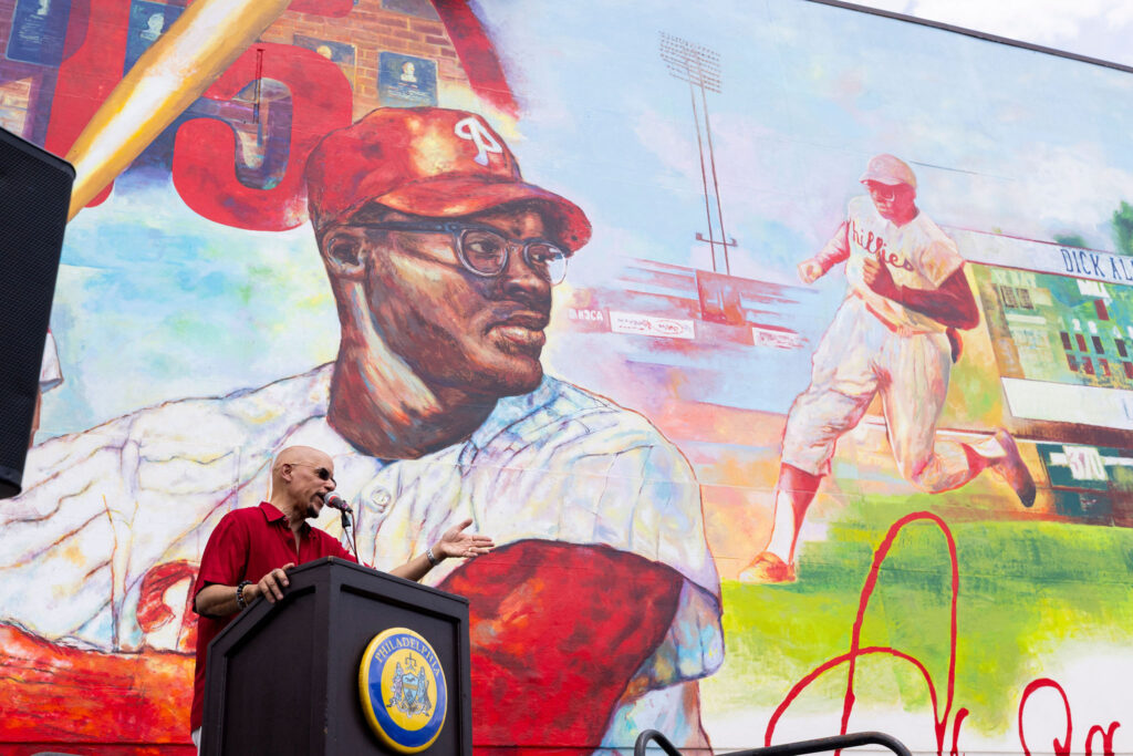 Mural Arts, in partnership with the City of Philadelphia and the Philadelphia Phillies, officially dedicated the mural Dick Allen, by Ernel Martinez. The mural celebrates Phillies legend Dick Allen, one of the top sluggers of his generation and the club’s first Black superstar. Photo by Gustavo Garcia, Colibrí Workshop.