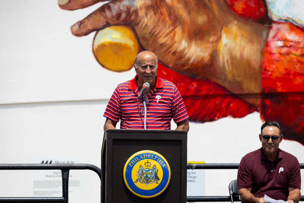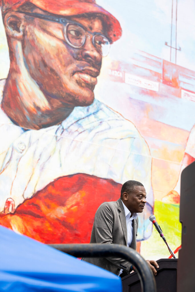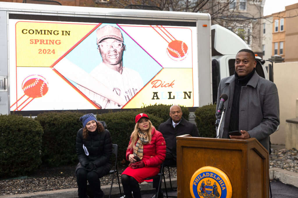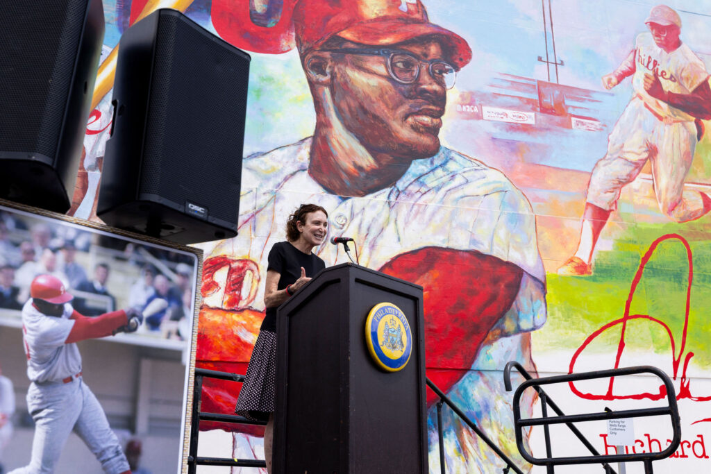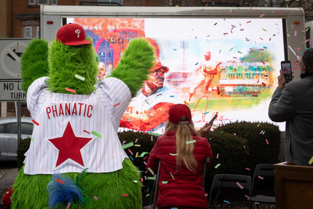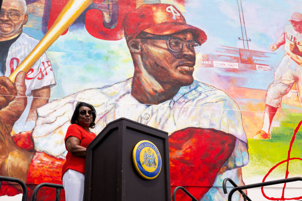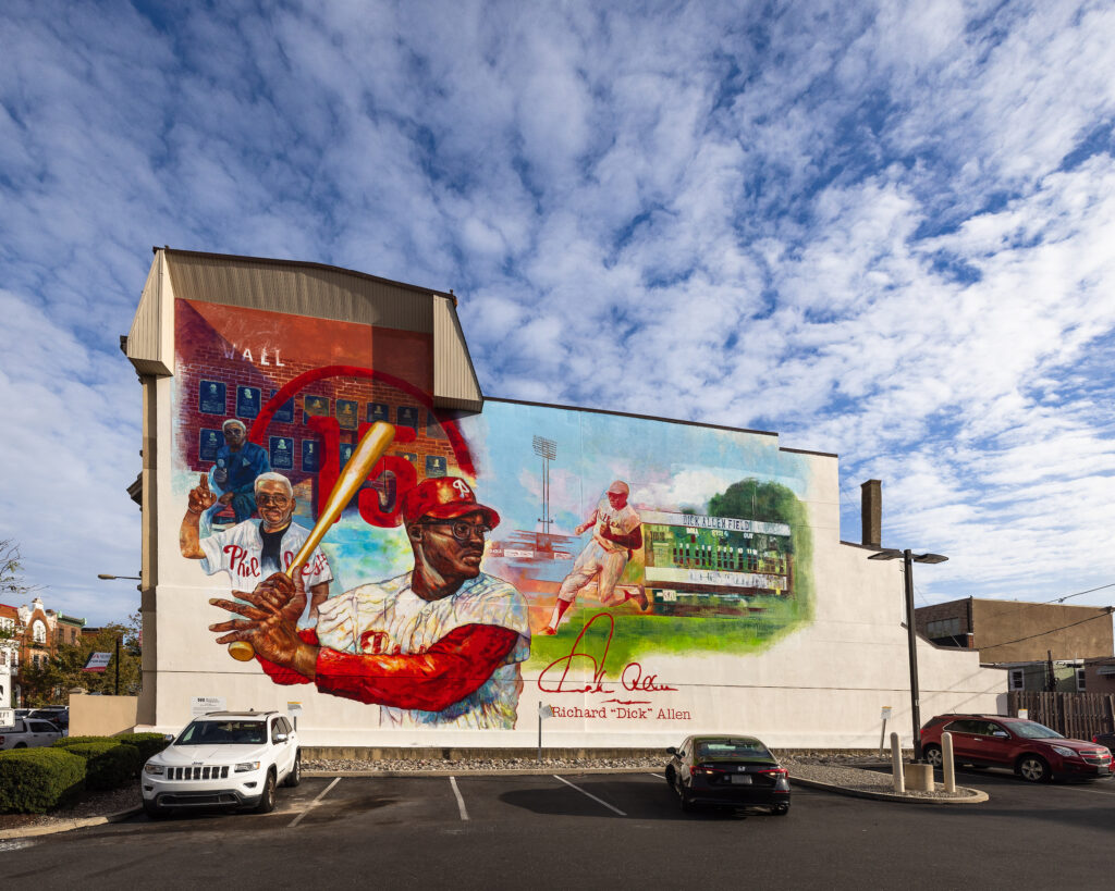 Mural Arts, in partnership with the City of Philadelphia and the Philadelphia Phillies, officially dedicated the mural Dick Allen, by Ernel Martinez. The mural celebrates Phillies legend Dick Allen, one of the top sluggers of his generation and the club’s first Black superstar. Photo by Gustavo Garcia, Colibrí Workshop.