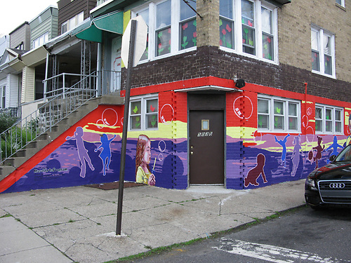 Diversity is Fun by Bernardo Ruiz brightens the side of a daycare center in the Logan neighborhood of Philadelphia, Pennsylvania. Portraits of a diverse group of students blowing bubbles are interspersed with silhouettes of children playing against an abstracted landscape. Students from LaSalle University participated in the creation of the mural as part of an annual day of service.