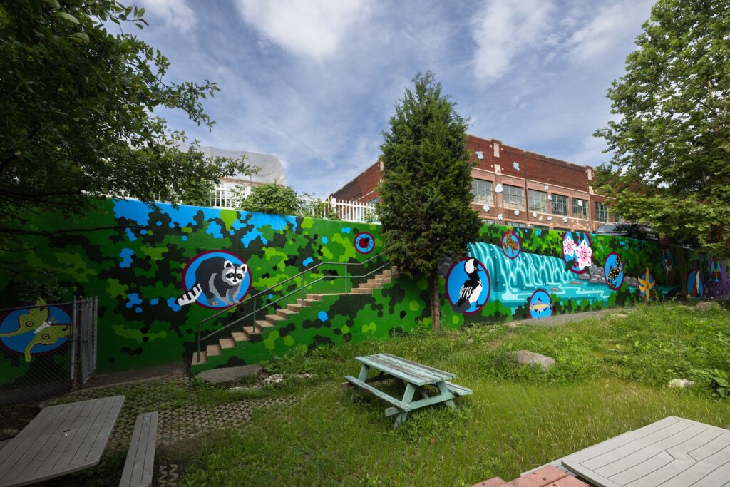 Location Note: Mural is on the rear of the Philadelphia Film Society building at 1412 Chestnut Street and is visible from Sansom Street.