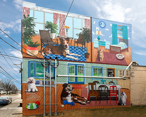Forever Home, a two-part mural created in collaboration between PAWS and Mural Arts Philadelphia, depicts rescued animals living in the safety of home, to promote awareness of PAWS’ efforts to save Philadelphia’s homeless pets. Created by artists Kala Hagopian and Ali Williams, an artist team known as Chroma Dolls, the murals feature pets that once lived on the streets or in shelters and now have loving families.
