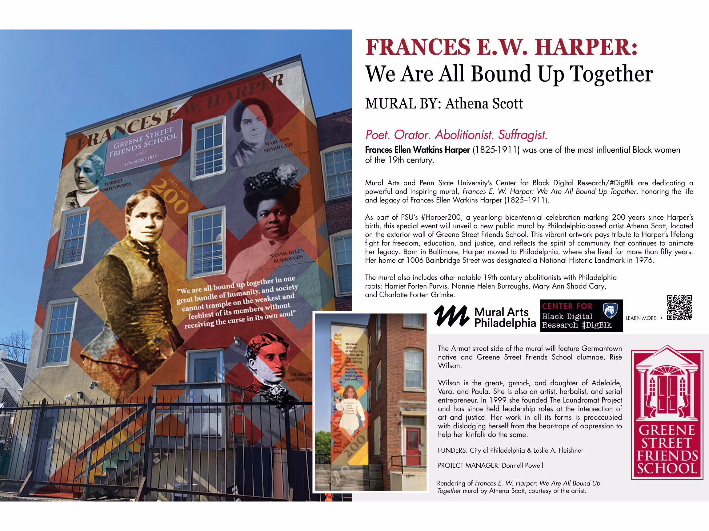 As part of PSU’s #Harper200, a year-long bicentennial celebration marking 200 years since Harper’s birth, this special event will unveil a new public mural by Philadelphia-based artist Athena Scott, located on the exterior wall of Greene Street Friends School. This vibrant artwork pays tribute to Harper’s lifelong fight for freedom, education, and justice, and reflects the spirit of community that continues to animate her legacy.
