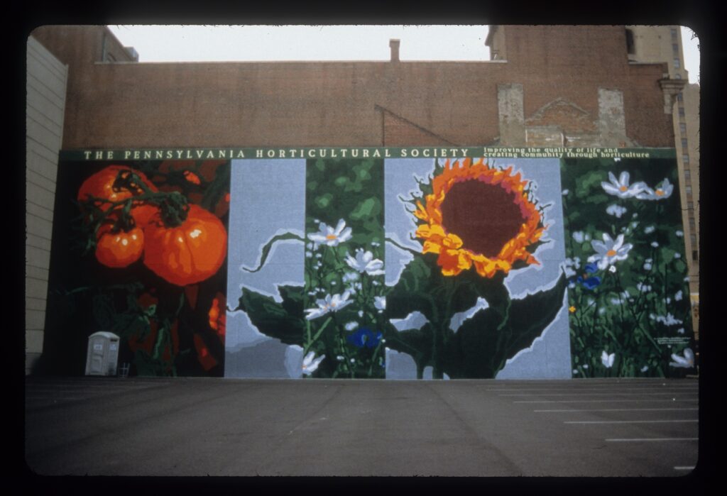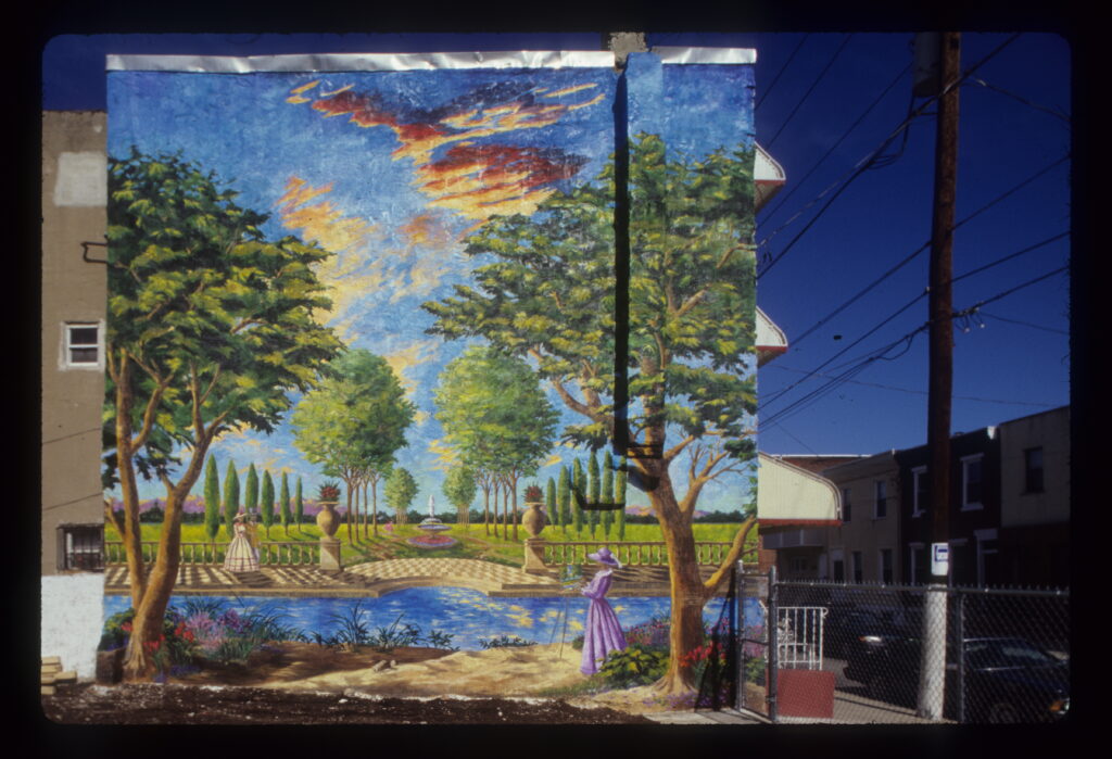 Garden Walk by artist Barbra Smolen was located in the King Village neighborhood of Philadelphia, Pennsylvania. The mural is a formal garden scene recalling a more idyllic and peaceful time but with a sky whose red, unsettled clouds acknowledge the tensions of inner-city life. The composition was influenced by a number of things. The unfinished the concrete oval in the lot became the shape of the pool in the mural. The landscape and figures are adapted from a Dutch 18th landscape of a formal garden. The figures in the mural reflect the individual who live in the community surrounding it. The sky, which is very dramatic and even somewhat menacing, was intended as a “reality check” to the pastoral theme and an acknowledgement that the community has to work to maintain its harmony and beauty, just like cultivating a garden.