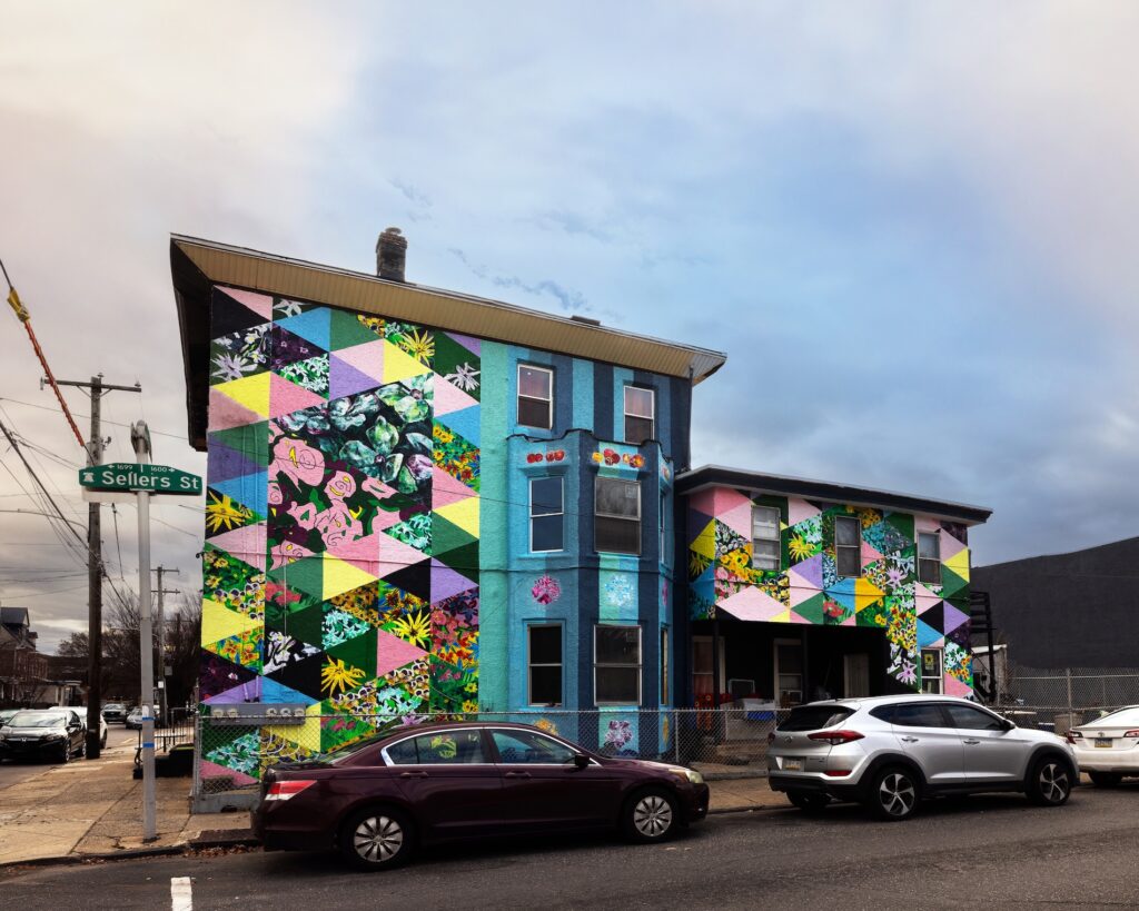 The Garden Wall series has been developed by Mat Tomezsko, and the Color Me Back: Same Day Work and Pay Program through Mural Arts in Kensington over several projects since 2021 to the present, including murals in three different Philadelphia neighborhoods: three in Kensington, one in Frankford (pictured) and one in Tacony.