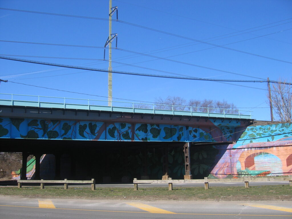 Gateway to Philadelphia by artist Paul Santoleri was located in the South Philadelphia. Painted across two bridges and their respective underpasses, this extensive mural depicts the nature that exists between the highways, railroads, and industry of Philadelphia. Each plant found in the mural is native to the area and one you would find in the surrounding area. Just like the large honeysuckle which can be found painted and planted throughout the city providing a pleasant scent for residents.