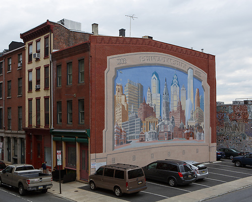 The narrow eastern wall of the mural depicts a massive door at ground level, with reproductions of three William Rush sculptures towards the top of the building. Rushs’ actual sculptures are on display at the Philadelphia Museum of Art.