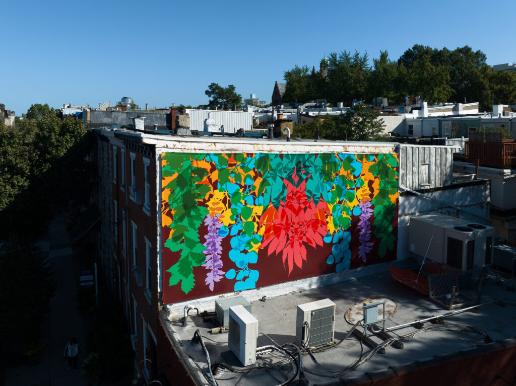 Hanging Garden by artist Kien Nguyen is located on the second story of a business at the border between the Fairmount and Spring Garden neighborhoods in Philadelphia, Pennsylvania. The mural was created in partnership with local organizations including the Fairmount CDC, Fairmount Civic Association, Spring Garden CDC, property owners and neighborhood residents. Nguyen based his design on community members’ request for an abstract botanical design. He was also inspired by the architectural decorations in the neighborhood and the idea of the floral window box.