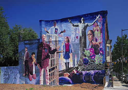 Originally conceived as a single mural created by victims and inmates, the two groups found it impossible to unite over a single, unified design. Instead, two similar murals were created adjacent to one another on the 3000 block of Germantown Avenue in North Philadelphia.