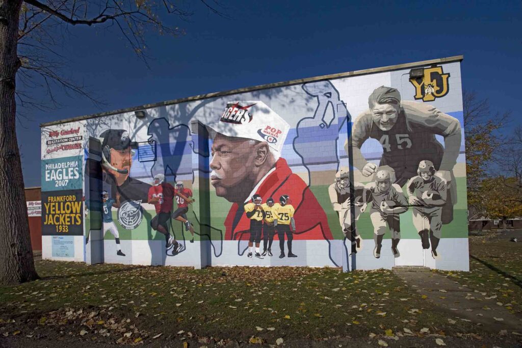 The mural project was part of a larger refurbishment of Frankford Field funded by the City of Philadelphia, Comcast Spectacor, Pop Warner, and others.