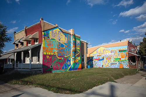 The Home Safe murals were designed collaboratively between artists Shira Walinsky and Ernel Martinez. They are a reflection on a journey from homelessness to having a home. The designs were inspired by maps created by women at Gloria’s Place, in a class taught by Walinsky. Gloria’s Place provides temporary housing to women and their children until they find more stable housing. These maps described where these women began their journeys, where they currently lived, and the stops along the way, including information about who they lived with and their mindsets at each place. One woman labeled stops along the way as “an angry place,” and another as “build a new dream.”
