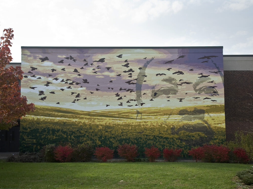 Honey’s Garden by Frank Hyder and Henry Bermudez is located in the Northern Liberties neighborhood of Philadelphia. Garden plants (tomatoes, eggplant, grapes, berries), mixed with images of the sun, birds, and the hand of man, are painted in a rhythmic dance as seen from the view of a child’s eye. The artists say of their work: “We are committed to the relationship between man and nature. The magic we find in the world around us is visible testimony. The sun’s warmth and sweetness of its affects are the essence of life.”