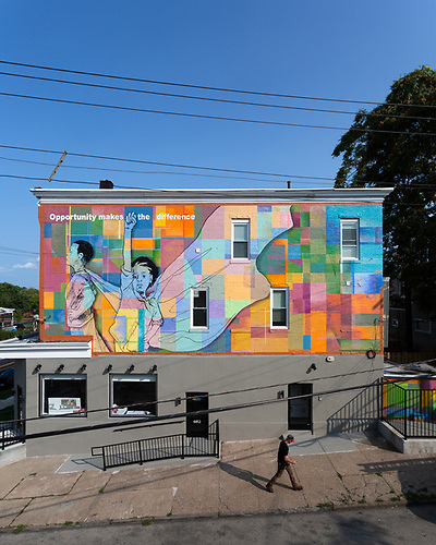 Imagine That depicts two children imagining they can be whatever they want to be. Artist Felix St. Fort employed bold colors to draw people toward the building that houses Trades for a Difference Community Learning Center on Chew Avenue. The mural’s theme reflects the Learning Center’s mission. Trades for a Difference offers career path services, soft-skills training and mentorship programs for neighborhood youth. emphasizing the power of young people to shape their futures.