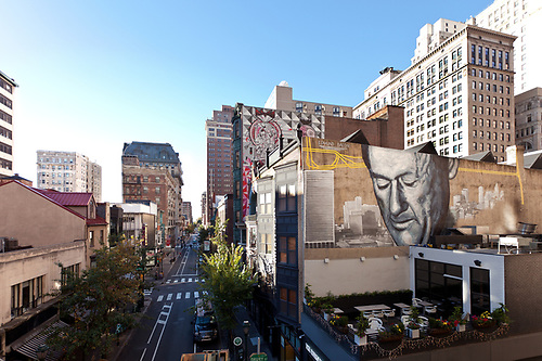 Gaia’s Legacy Project showcases architects in the context of the cities that they helped to create. In Philadelphia, no one has a larger legacy than architect and urban planner Edmund Bacon. The abundant use of light colors such as white and grey help the portrait to stand out for blocks. In the mural, Bacon gazes down at those traveling the streets of the city that Bacon helped so much to shape.