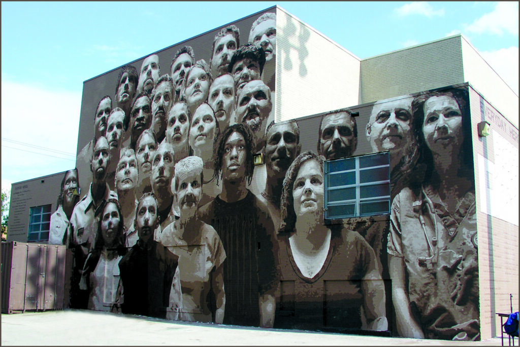 During his time in the neighborhood, Viveros identified four main themes to address in the mural designs: History, Pride (pictured here), Potential, and Community. The first three murals were installed in the fall of 2012, followed by another series of community meetings and paint days into the winter for the fourth and final mural, which was installed in fall 2013.