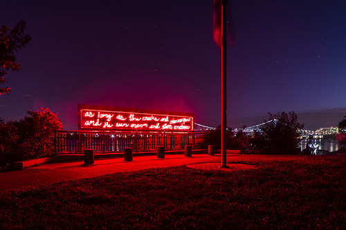 Duane Linklater’s In Perpetuity served as a monument to Lenni Lenape Chief Tamanend. It was also a historical reference point to understand the broad erasure of Indigenous people from the lands that now include the city of Philadelphia. The artwork was installed on the banks of the Delaware River, on ground that has served as a meeting place for Indigenous communities for thousands of years. In 1682, William Penn and Chief Tamanend met to secure a “treaty of friendship.” The scope of the Lenape’s agreement, according to historical accounts, was meant to last “as long as the rivers and creeks flow, and the sun, moon, and stars shine.” Linklater, an Omaskêko Ininiwak from Moose Cree First Nation, asked his nine-year-old daughter, Sassa, to handwrite these words. He then worked with Philadelphia-area neon fabricators to reproduce the phrase in a neon sign on the edge of the river in order to mark the enduring legacy of the Lenape people and the unraveling of a treaty intended to promote long-standing coexistence.