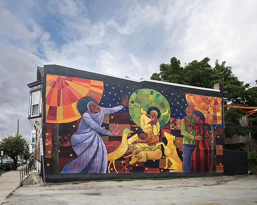 The east mural (featured here) includes a woman clad in royal purple, representing nature. A woman in the center of the mural is the grandmother, a community matriarch. The birds surrounding the women represent the continuity of established family histories, indicating that all is known in the world within the comfort of the family. A father and mother with dogs who protect the children. The puppy and two others also reflect the human family and the idea that “a dog is man’s best friend.” The peacock with its tail is open showing “a thousand eyes” looks out to protect the child. All of these protective symbols surround a young child who the grandmother holds to her cheek. The scene is balanced on each side by trees with circular yellow and orange leaves representing the constant spiral of life.