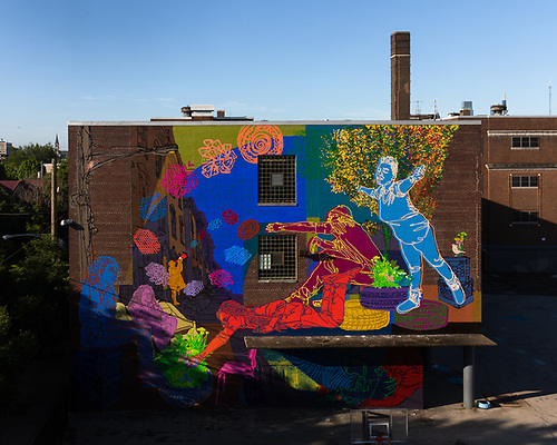 Industrious Light: Brewerytown is the fourth artwork in the Industrious Light series from artist Phillip Adams, this mural speaks to the scale of industrial brewery production and the grandeur of the Brewerytown neighborhood. In the late 1800s and early 1900s, Brewerytown had 11 functional breweries that produced 50% of the beer distributed in Philadelphia. Bergner and Engel Brewing Company, the third largest brewery in the United States in the 1880s, was located across the street from the mural site and is featured in the left part of the design.