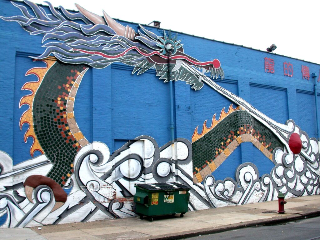 Inheritors of the Dragon was created by artist Mike Smash in the Hawthorne neighborhood of Philadelphia, Pennsylvania. The work was created with ceramic tiles, stained glass, and mural paint. Smash worked with students at the Hawthorne Cultural Center as part of the City of Philadelphia’s Mural Arts Program’s Artscape Program, which enrolls adjudicated teens in art workshops. The artist chose the dragon theme because he believes that murals should adapt to the surrounding culture of the neighborhood it is in—and this is a predominately Vietnamese and Chinese neighborhood.