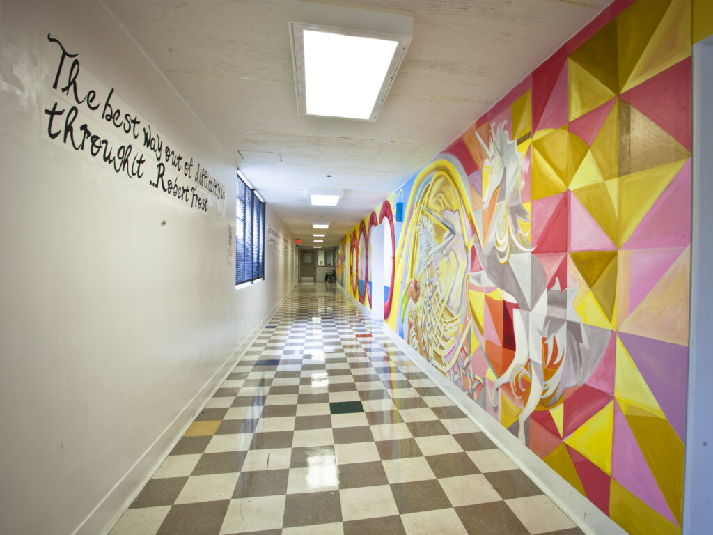 The design of Inspirations by artist Cesar Viveros was based on quotes discussed with students at the City of Philadelphia Youth Study Center. This led to study of ancient mythology, from which the students produced drawings and ideas that inspired the design. The wall was divided into three stages: at the far left there is a narrative of the phoenix bird who immolates itself to be reborn into a new life. From there, a swirl of images progressively show stages of the cycle of life and how life passes by in front of our life while we decide how to take the best of it. It also remarks the fact that no matter how many mistakes we make because we can always learn from it and start all over. The middle segment on the mural shows the images of a mythological monster that we all should conquer because this one represents all the weakness of the human spirit that do not let us move forward as could be fear, insecurity, etc. – a monster within us that we can conquer. The last image on the mural is about building a community together.