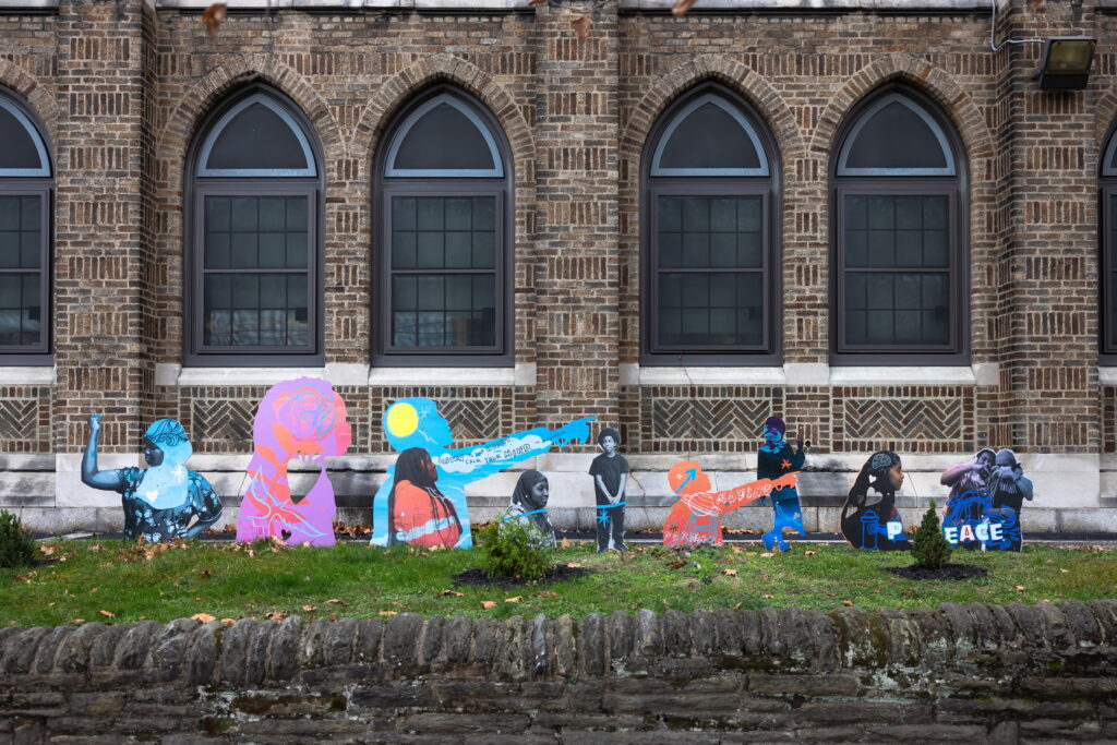 The quote by Rosa Parks reads: “I would like to be known as a person who is concerned with freedom, equality, justice, and prosperity for all people.” The homeowner’s granddaughters appear at the bottom left of the mural as figures representing the influence of Rosa Parks on future generations.