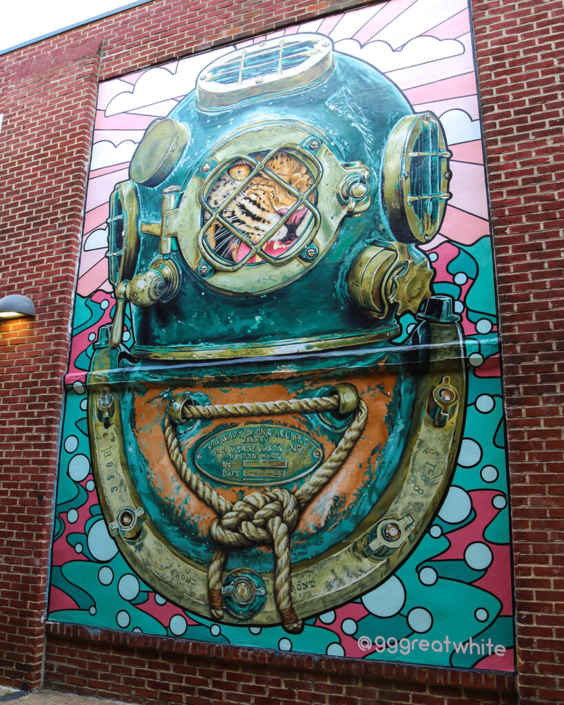 One of four new murals painted on Front Street Walls in 2023. It’s an 15’x18′ mural depicting a realistically painted snarling jaguar in a scuba helmet with a graphic colorful background.