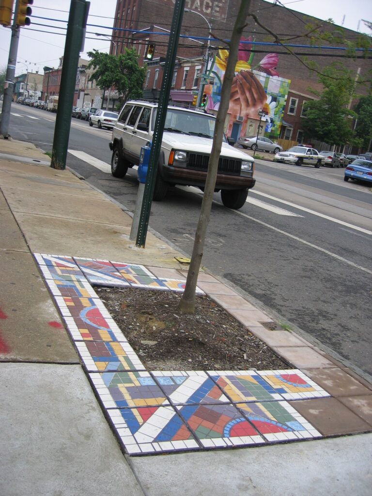 These mosaic surrounds for tree foundations were created by Mike Smash and Johnny Buss and were located along the 3800 and 3900 blocks of Lancaster Avenue in West Philadelphia.