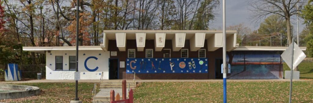 This landscape mural (title unknown) was created by the Philadelphai Anti-Graffiti Network and is located in the Germantown neighborhood of Philadelphia, Pennsylvania. It depicts a serene landscape with a flowing river and picturesque waterfall.