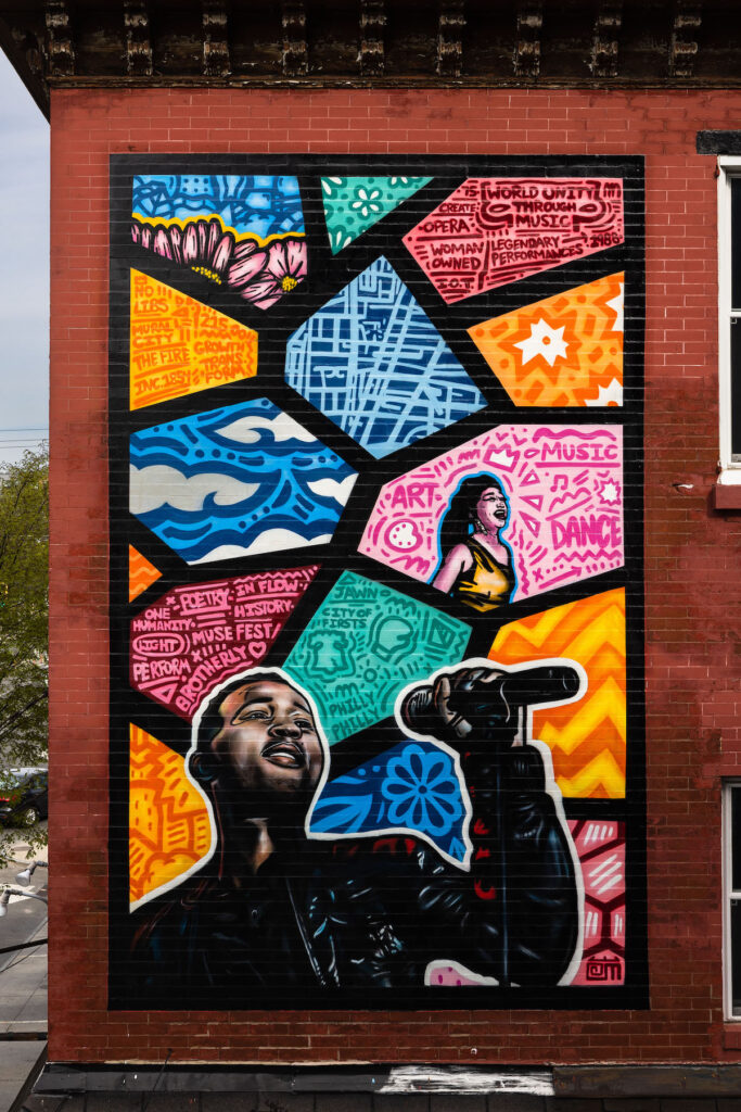 Legendary Performances by artist Alloyius Mcilwaine is located on music club The Fire in the Northern Liberties neighborhood of Philadelphia. The mural honors the legacy of The Fire, Philadelphia’s only woman-owned music venue, and celebrates the rich artistic history of the Northern Liberties neighborhood. The focal point of McIlwaine’s mural is the artist John Legend, who performed at The Fire early in his career. More broadly, the mural speaks to the power of music – from R&B to opera – to connect people and communities. Distributed throughout the image are the artist’s signature “kudoglyphs,” symbols that “present ideas of positivity and push forth a message to reach for your dreams.” The mural was dedicated with a two-hour event that featured music, food, and drinks, followed by an evening of live music, including a John Legend tribute show.