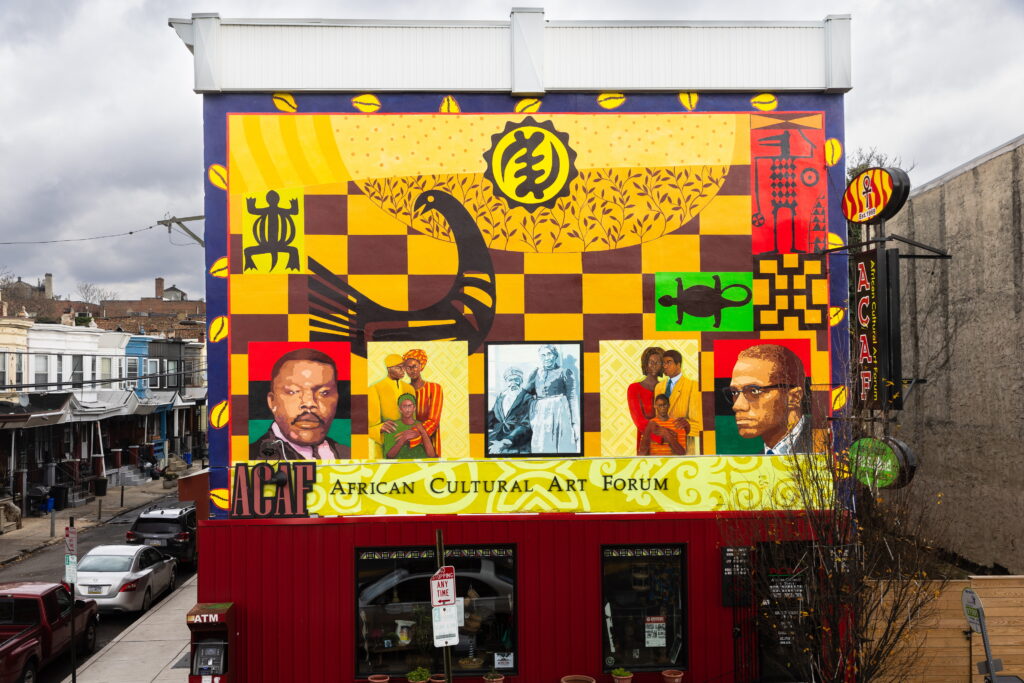 Santoleri portrayed both of the communities in bright colors so that the experience of the mural, in a car, is like passing through bands of color, an inverted rainbow, but walking past, a viewer sees all the details and moves naturally from the neighborhood of Mantua to the Zoo, following the parading animal cutouts that disappear sometimes, i.e. a polar bear might look like a galaxy in one section, then he’s walking on the rooftops of Mantua in another section.