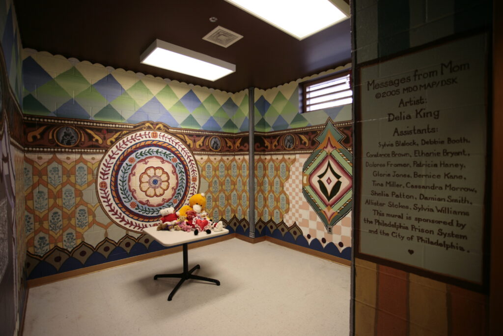 Messages from Mom by artist Delia King is painted on an interior wall of the Riverside Correctional Facility for women in the Upper Holmesburg neighborhood of Philadelphia, Pennsylvania. This mural features series of abstract mandala-like shapes in a field of singular flowers. A border separates the main portion of the mural from the upper register which contains mountain like shapes. Within the border are small circles containing portraits of a mother talking to her children, who surround her.