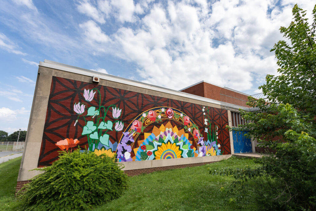 The mural uses perennial flowers as a metaphor for high school, as we [students] all come back every year. The radial patterns and line drawings grow together to rise up to meet the neighborhood’s students, staff, and families.