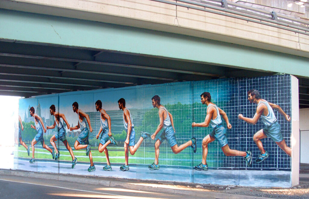 Tribute to Edward Muybridge by Eric Okdeh was part of the Murals in Motion series, an initiative of the City of Philadelphia Managing Director’s Office. Okdeh created this series of three murals as an homage to the 19th century English photographer Edward “Eadweard” Muybridge (1830 – 1904 Kingston-on-Thames, England). A contemporary of Thomas Edison, Muybridge was a pioneer photographer of the moving image. Okdeh’s mural is in three panels featuring a horse, a man, and a cyclist in different stages of motion against different backdrops of Philadelphia. The murals appear to be in motion when viewed from passing cars.