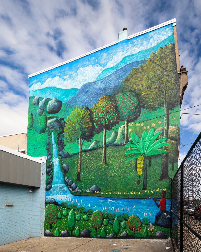 The Nelson Playground mural by Frito Bastien is a reenvisioning of a mural that was created at the same site in 2005. Like many of Bastien’s murals, this one exemplifies his Haitian roots and style. Born and raised in Haiti, artist Frito Bastien created his second Haitian landscape at Nelson Recreation Center after upgrades to the park included the resurfacing of the original wall. The new mural features cascading waterfalls, butternut trees, banana trees, apple trees, and a boy fishing. The landscape is inspired by Bastien’s memory and imagination. It also represents flora and fauna from all seasons. The mural provides natural beauty to viewers and makes the greenery of the park seem to extend well beyond what is usually expected in a city.